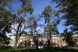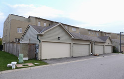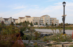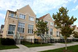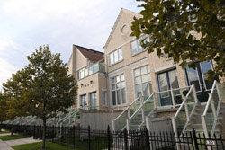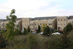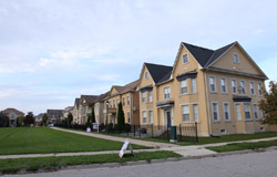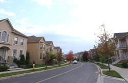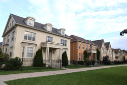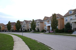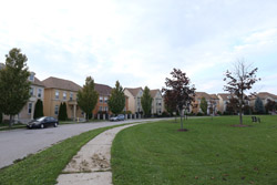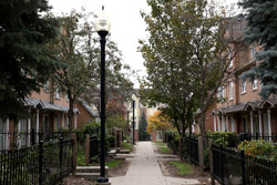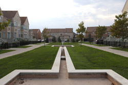 Here, the typical suburb of detached homes, long driveways, and empty sidewalks cannot be seen. In this community, front doors face a pedestrian-only path and buildings are packed more closely together. Cars are mostly hidden from view underground.