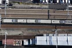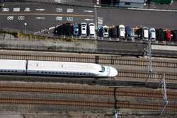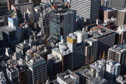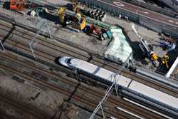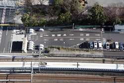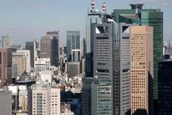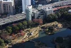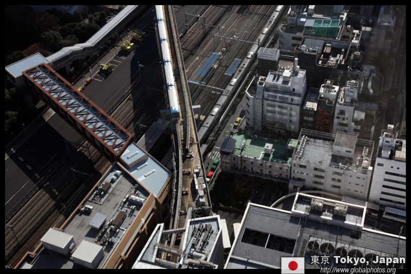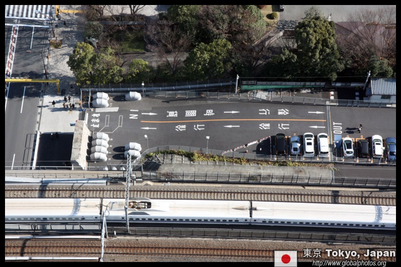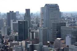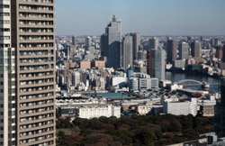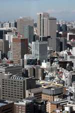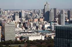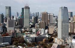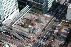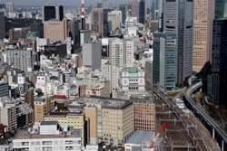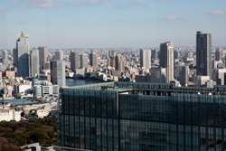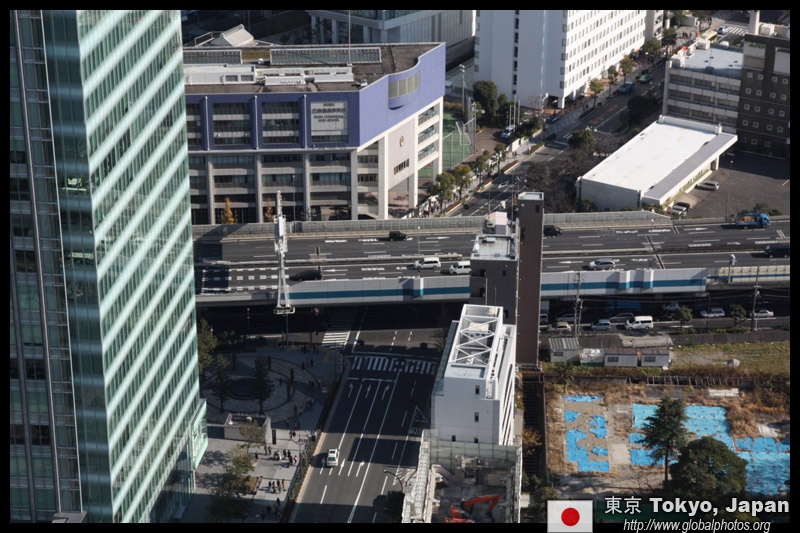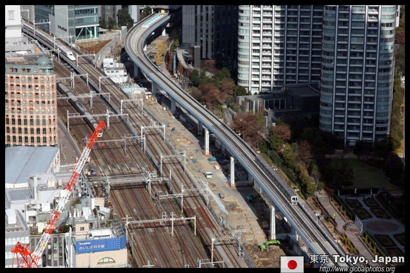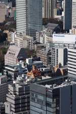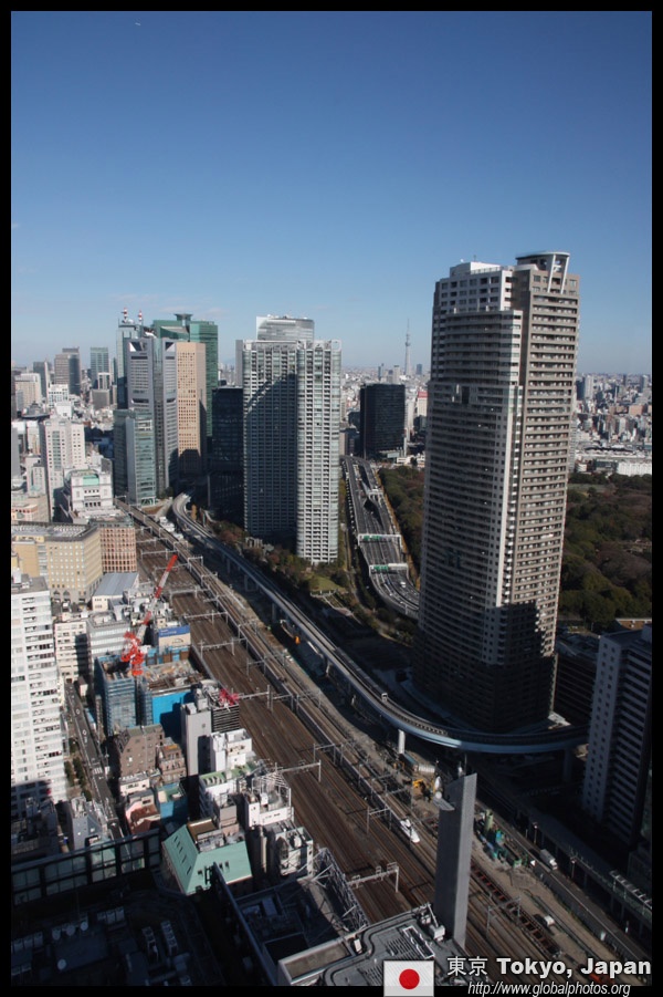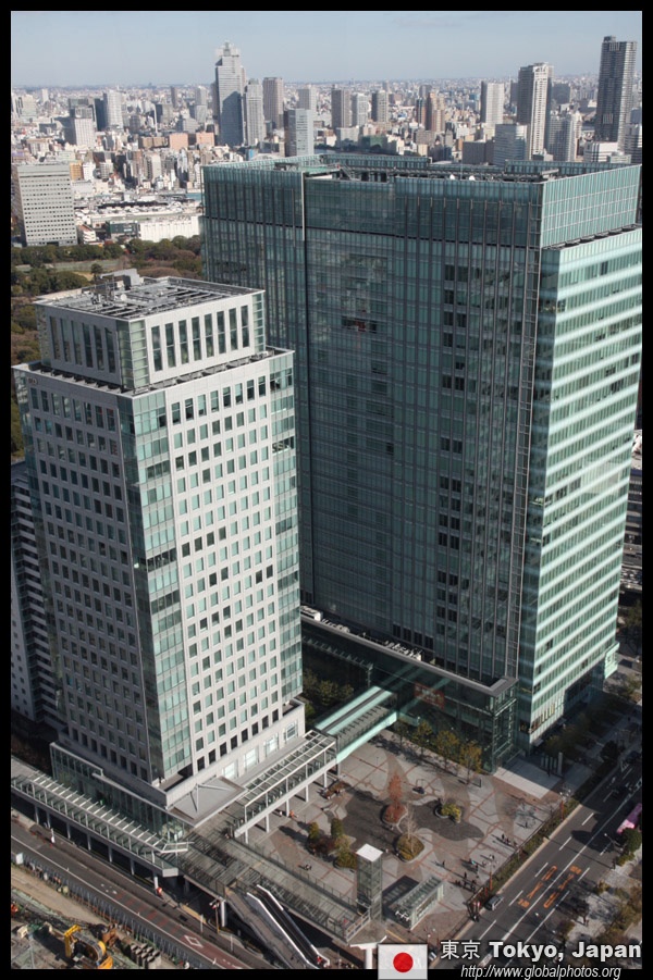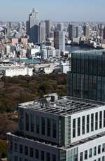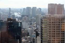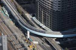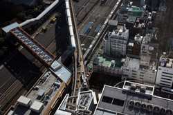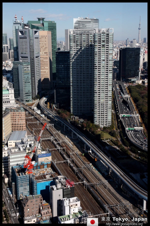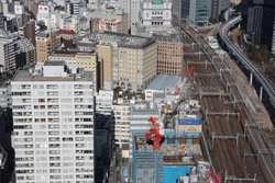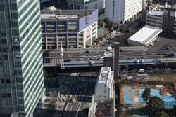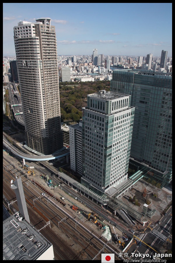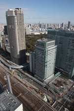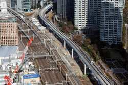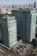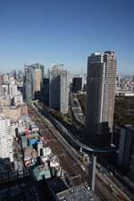 Shiodome's skyscrapers come into view, and Marunouchi's shorter buildings are further away.