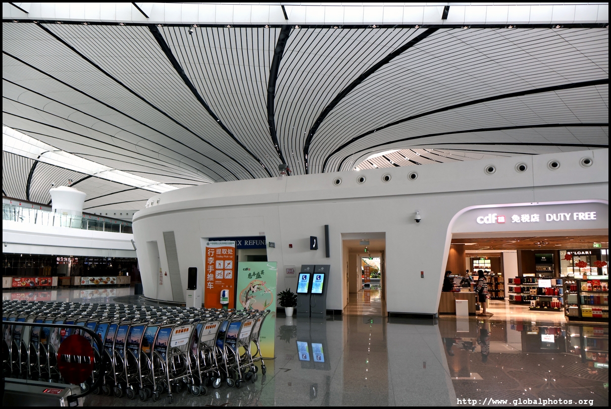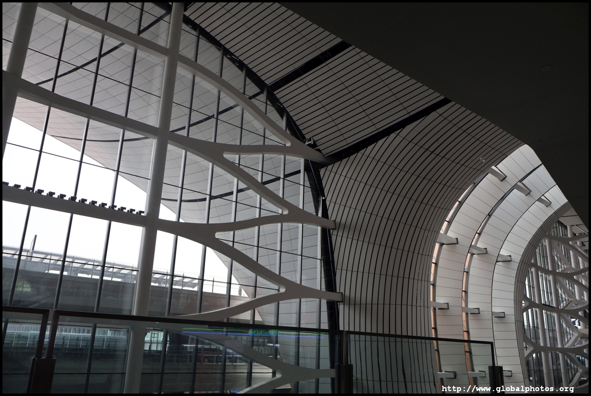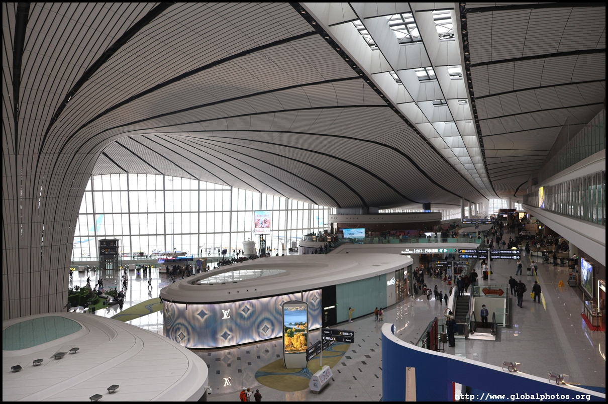 The international check-in area is far more sleek and airy with a wavy architectural design. It's a Zaha Hadid creation that costed $11.5 billion with construction starting in 2014.